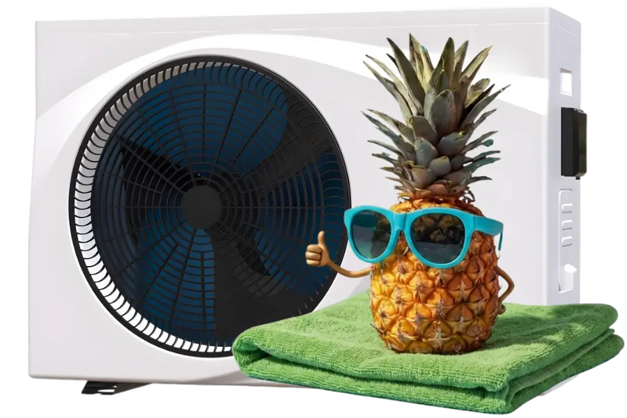Heat pump pool heaters are almost like a reverse air-conditioner. Instead of drawing in warm air and exchanging it for cooler air, a heat pump draws in air at any temperature and cools it down. In the process, very warm air is compressed and heated even further. This super-heated air uses the law of thermodynamics to heat incoming pool water.